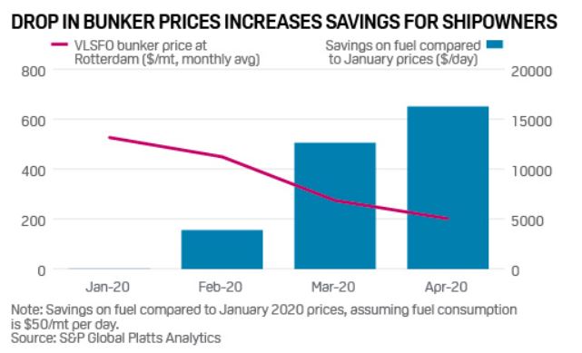 The precipitous drop in bunker prices has led to increased savings for shipowners. Platts data shows the average drop in VLSFO prices of $325/mt between January and April means that shipowners were set to save $16,266 a day during April, assuming a vessel consumes 50 mt/day of fuel.
