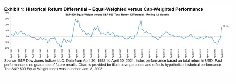 After almost four years of underperformance, we witnessed a change in fortune in February 2021, as the relative performance of the S&P 500® Equal Weight Index turned positive. By the end of April, Equal Weight had outperformed the S&P 500 by 11% over the prior 12 months, as we see in Exhibit 1.