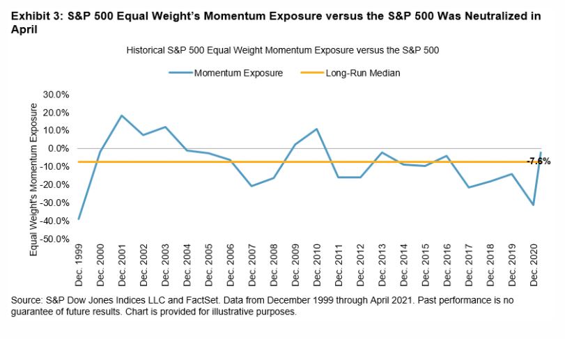 Equal Weight’s recent rebound naturally had an impact on its factor exposures, particularly for the momentum factor. To provide context, in Exhibit 2, we plot the annual relative performance of Equal Weight on the x-axis and Equal Weight’s (risk-adjusted) momentum exposure on the y-axis, including the most recent 12-month period, as of April 30, 2021.