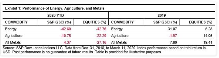 In our blog post from December 2019,[1] we highlighted the disparity seen last year between different sectors of the commodity futures and commodity equities markets. The second thing to watch highlighted the substantial 25% performance difference in 2019 between the S&P GSCI Energy and the S&P GSCI Equity Commodity Energy Index. However, so far in 2020, these different asset classes have moved in lockstep (see Exhibit 1). The other noticeable takeaway is the complete reversal of last year’s positive performance across the different commodity equities.