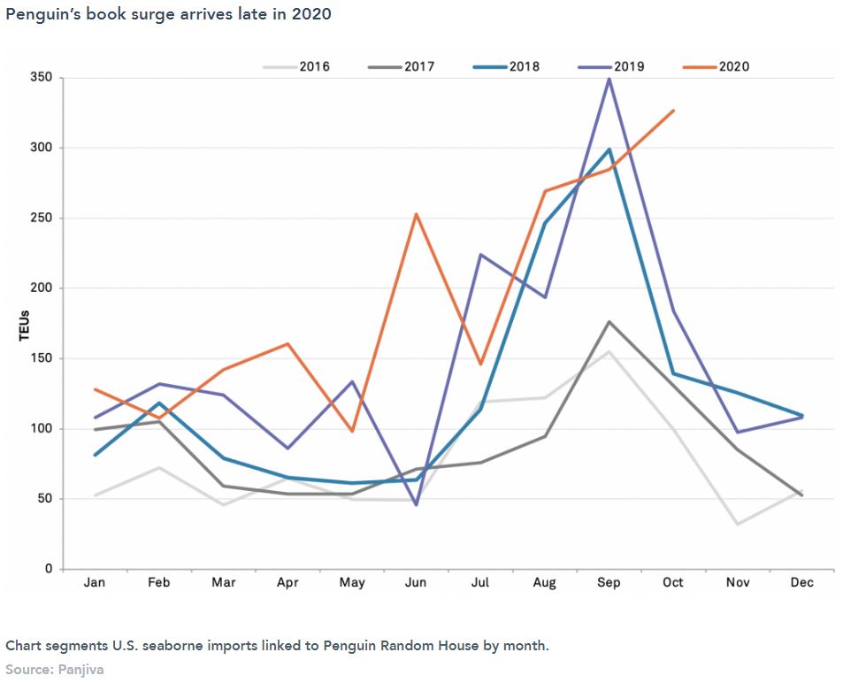 The book industry more broadly has seen a wider slowdown in activity during the pandemic, perhaps indicating the increased use of e-books shown previously by Scholastic and discussed in Panjiva’s research of Sept. 29. There are signs of a turnaround however, partly driven by Penguin Random House’s recovery.