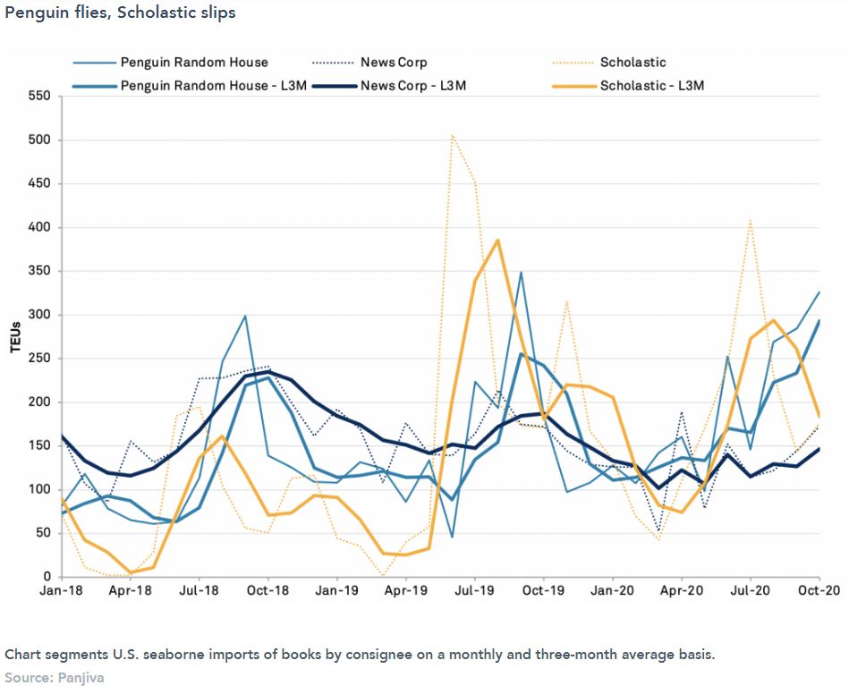 Total U.S. seaborne imports of books increased by 5.8% year over year in October after a 15.3% drop in Q3’20 and a 26.5% decline in Q2’20. Aside from Penguin Random House, owned by Bertelsmann, there was also a recovery to a 0.4% improvement in October from a 31.1% drop in Q3 in shipments linked to News Corp’s HarperCollins. Scholastic has also entered a modest recovery with an improvement of 2.8% in October from 4.9%, suggesting that the recovery includes children’s books.