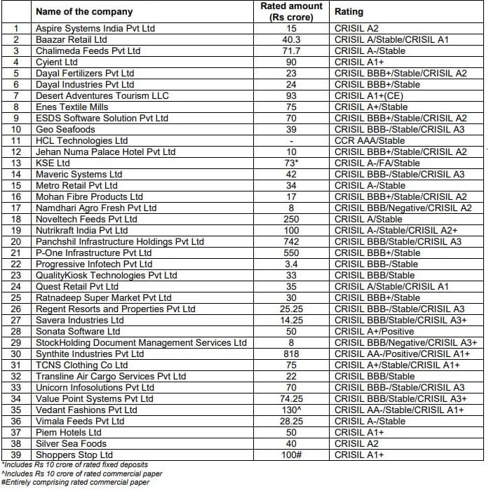 CRISIL has taken a rating action on 81 companies out of these, while ratings on the remaining 39 have been retained at existing levels. The actions are largely driven by near-term challenges to liquidity, which could impact financial flexibility. A summation of the rating actions are given below: