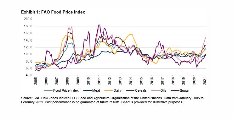 The FAO Food Price Index (FFPI) measures the monthly change in international prices of a basket of food commodities. Exhibit 1 illustrates the volatility of the basket and its sub-sectors over time. While the FAO Vegetable Oil Price Index reached its highest level since April 2012 in February 2021, this price appreciation should be viewed in the context of higher food prices across the board driven by a combination of disrupted supply chains in the wake of COVID-19, restocking demand, weather-driven supply issues, and higher energy prices.