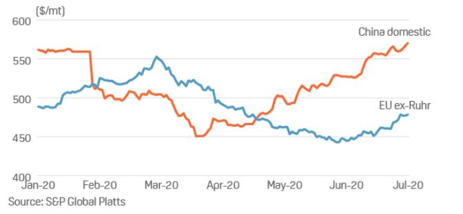 What’s happening? An upward trend in Chinese and German domestic hot rolled steel coil (HRC) prices indicates market recovery from COVID-19-related restrictions in both countries, but at quite different paces. China domestic HRC prices show a classic V-shaped recovery on a stimulus-fueled resumption of steel-consuming activities, which has brought Chinese steel prices up by around $100/mt since the start of May. German domestic HRC prices meanwhile show a more gradual U-shaped recovery.