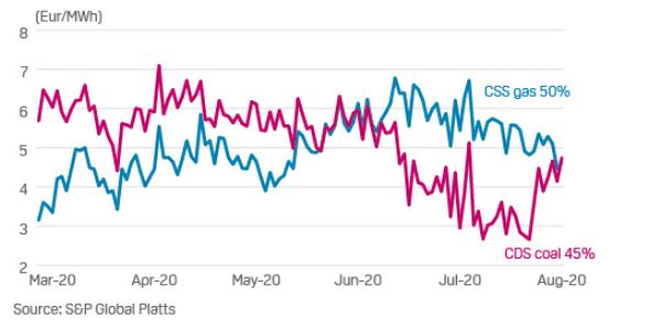 What’s happening? German coal-fired generation margins have recovered from record lows in July and moved again above comparable gas-fired margins for 2021, S&P Global Platts data showed. Behind the latest swing is EU CO2 prices falling sharply from a 14-year high and a rebound for TTF gas prices, while front-year coal into Europe fell with hardly any coal plants running in Western Europe this summer. However, the long-term trend of improved gas margins remains intact with RWE and Uniper to return mothballed gas plants to service in October.
