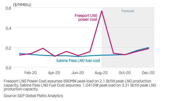 What’s happening? Freeport LNG terminal in the US has been ramping up recently, after 22 straight days of zero or near-zero observable feedgas deliveries in July. Fuel costs could impact how much of a near-term rebound in utilization the Texas facility sees compared with other US facilities that produce their power on site. Its power costs could exceed 50 cents/MMBtu in August, making for unfavorable production costs, according to S&P Global Platts Analytics data.