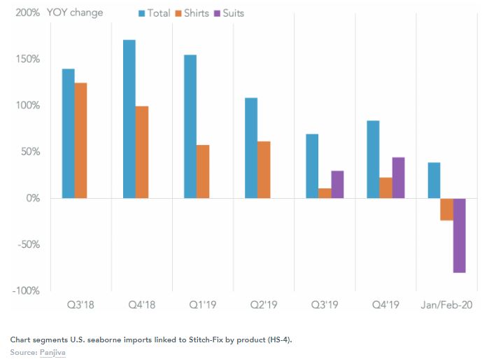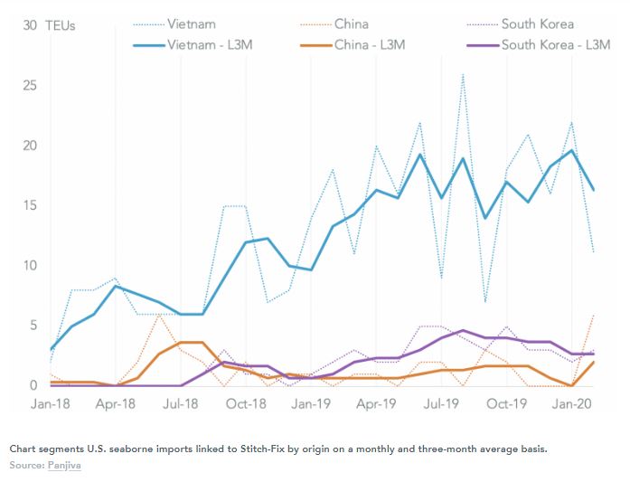 Panjiva’s seaborne data shows Stitch-Fix likely cut its imports from China to 4.7% in 2019 compared to 13.2% in 2018. Instead it has scaled up imports from Vietnam to 77.6% from 74.4% and those from South Korea to 14.9% from 4.7%. A renewal of shipments of China in February 2020 may reflect the reduction in section 301 duties to 7.5% from 15.0% from mid-month as part of the U.S.-China phase 1 trade deal.
