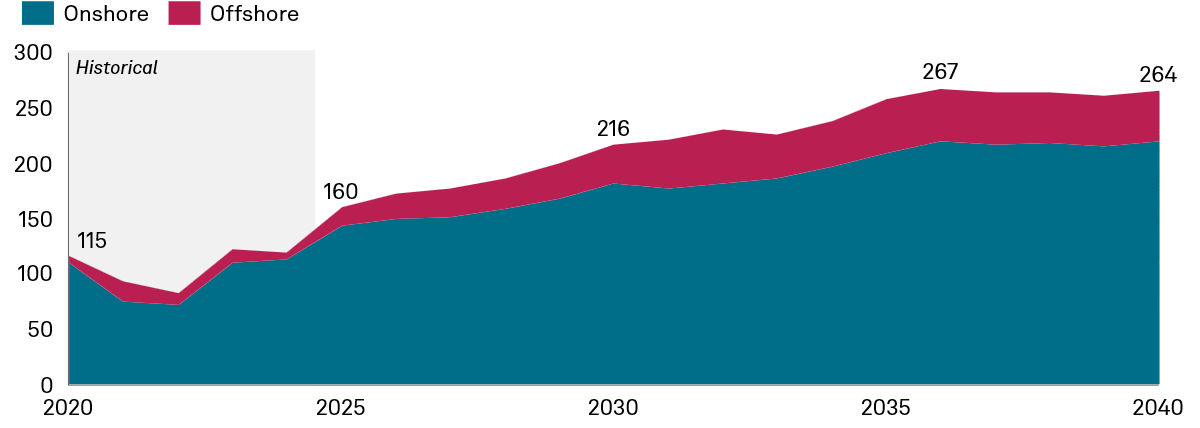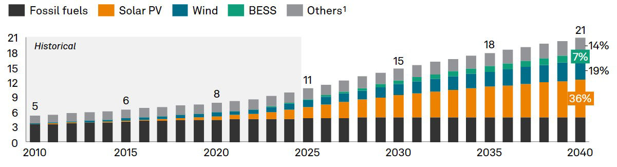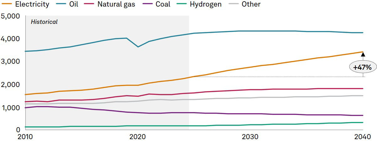 Today, these sectors are accelerating not just to address emissions, but to meet the needs of an energy sector pivoting towards a more electrified future. This shift to electrification is aimed at reducing dependence on fossil fuels, with renewables driving new power capacity additions. Global electricity demand is forecast to grow by 2.7% annually from 2025 to 2040 in S&P Global’s Base Case scenario outlook. This shifting energy mix with a greater focus on electricity will drive a substantial increase in future copper demand.