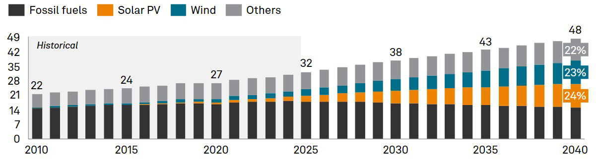 In S&P Global’s base case, global electricity demand will increase by nearly 50% by 2040. And this surging electrification is advancing around the world. In the United States, for a quarter century, electricity consumption hardly rose year over year, but it is now beginning to grow at what could be 2.5% annually. In China – with an electricity market more than double that of the United States – it will grow at 3.2% per year between now and 2040. In India, it will be 4.2% per year.