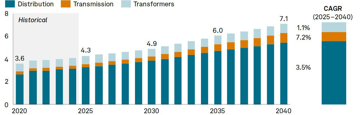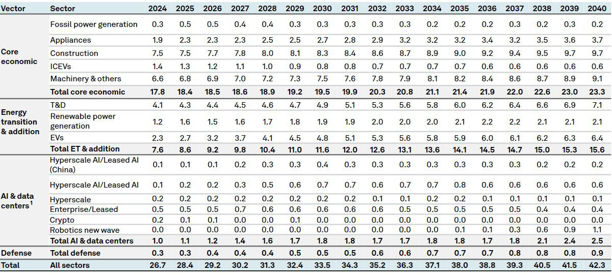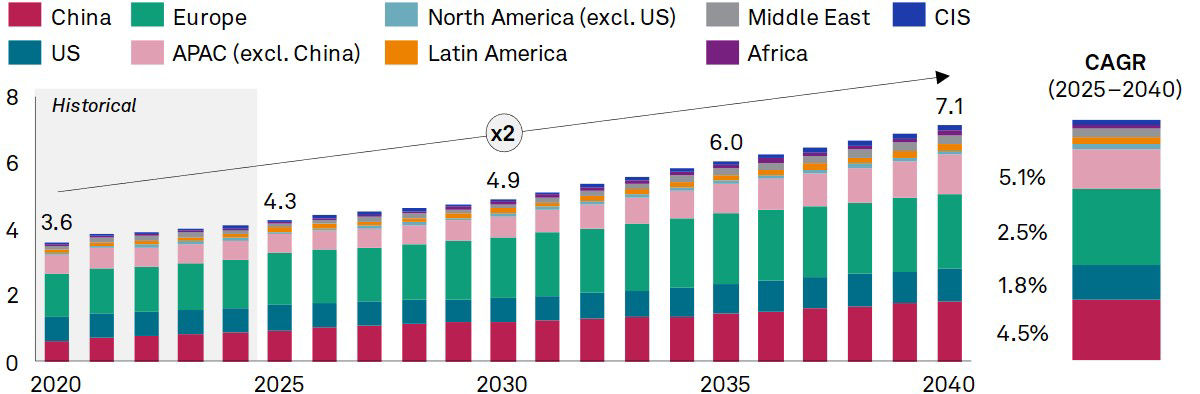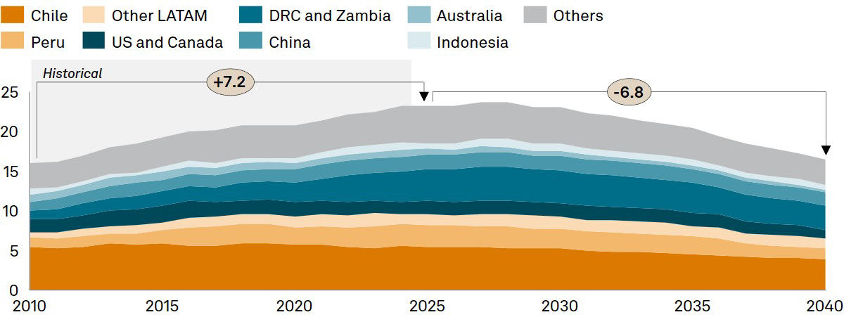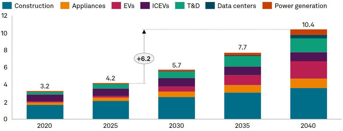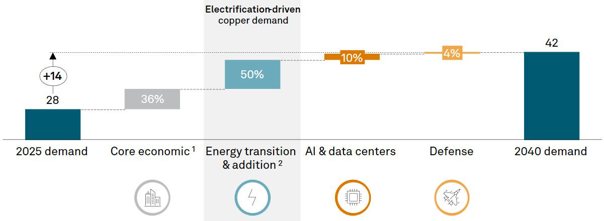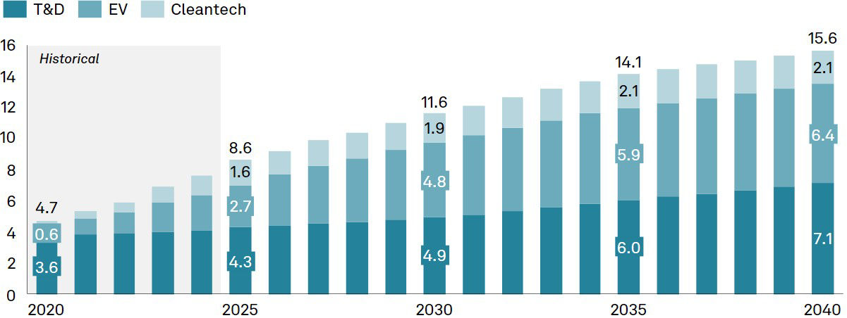S&P Global forecasts that energy transition demand will be the largest source of copper demand growth between 2025 and 2040, requiring an additional 7.1 million metric tons of annual copper demand between now and 2040. This demand will increase from 8.5 million metric tons in 2025 to 15.6 million metric tons in 2040, an annual growth of 4.1%.