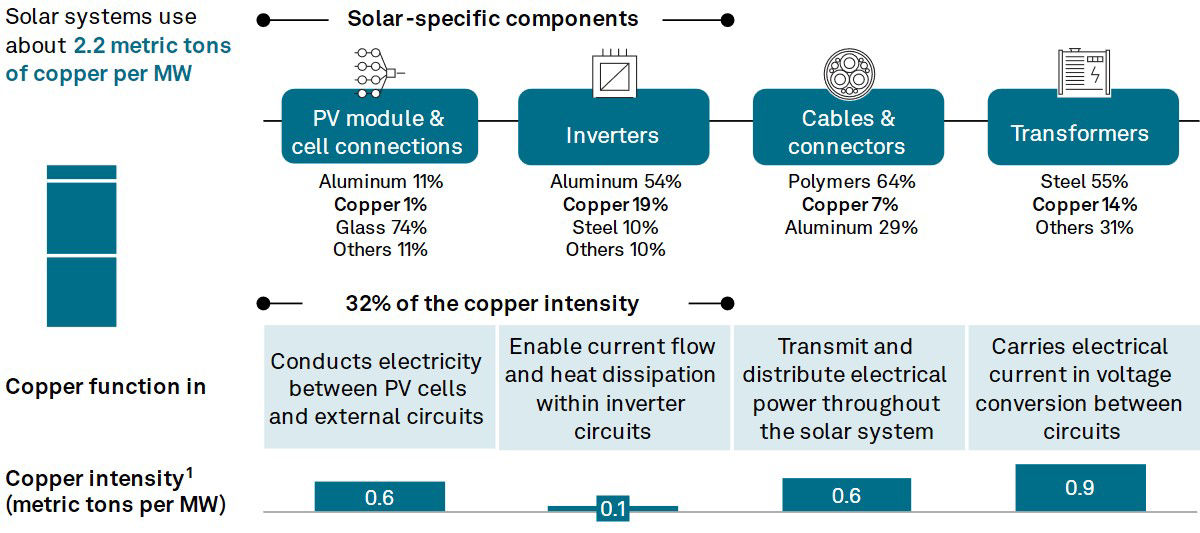 Copper’s role in the energy transition arises from its exceptional conductivity (only silver is better as a conductor), durability, and recyclability. It is used in power cables, transformers, inverters, switchgears, busbars, and a range of renewable energy systems including solar photovoltaic (PV) modules and batteries.