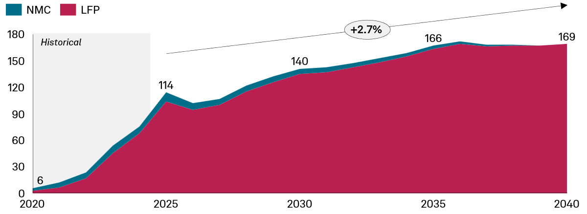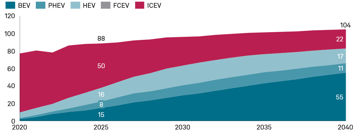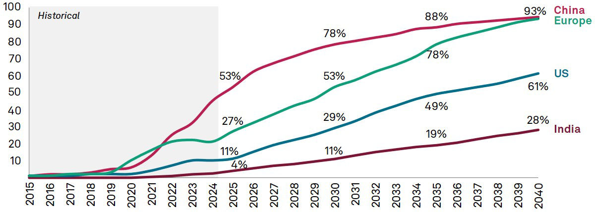 One big exception to the growth trends described above is traditional automobiles. In contrast to the other segments of Dr. Copper, copper demand for ICE vehicles will decline in the coming years, falling 5.5% annually between 2025 and 2040. This decline is driven largely by the increasing penetration of EVs into the market and slowing ICE vehicle sales in key regions around the world. As a result, ICE new vehicle sales are expected to drop from 50 million in 2025 to 22 million in 2040. While the EV ambitions of the early 2020s have tempered in Europe and North America, that is not at all the case in the world’s largest auto market, China, and Chinese-built EVs are gaining market share in much of the world.