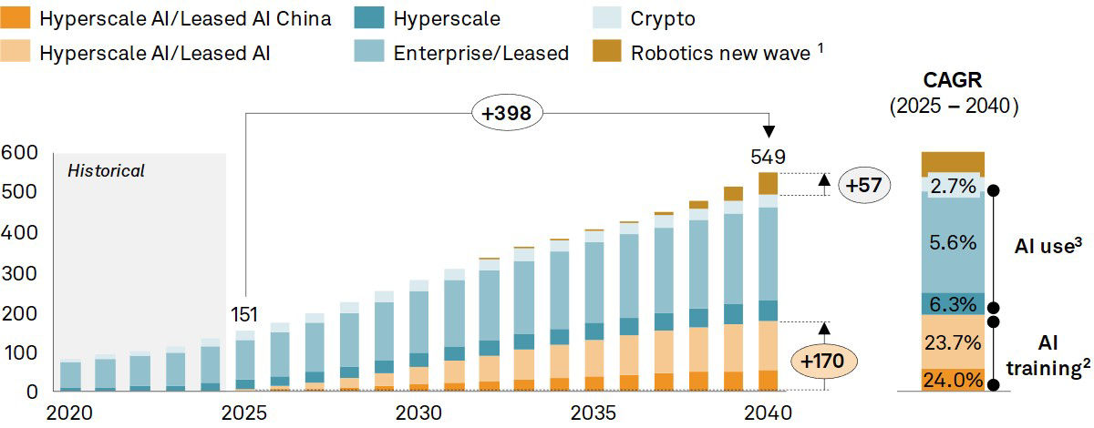 Data center AI workloads can be mainly categorized as training or use/inferencing. AI training involves large-scale computing that feeds data into algorithms to help an AI model iteratively learn patterns and relationships. Training requires machine learning algorithms and significant computing power but tends to not be latency sensitive, as the data processing is relatively self-contained. This means the data center can be in more remote locations to alleviate pressure on capacity-constrained electrical grids. AI inferencing/use requires less computing power than AI training and is often not latency-constrained and therefore can, in some cases, be in remote locations. However, there are some AI inferencing use cases that require low latency or interaction with a large amount of data that is not part of an AI training facility. In this case, the AI inferencing center may need to be located close to end-users or to the data required.