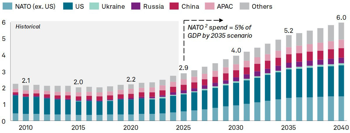 The final vector of current copper demand is defense. Rising geopolitical tensions and the electrification of military systems and the battlefield itself are driving up spending on defense and the push for new technologies. The investment in these technologies and systems is “inelastic” – given the national security stakes. Notable is the pledge by NATO members to increase defense spending to five percent of GDP. Modern weaponry, communications, and infrastructure are increasingly copper-intensive, and defense-driven demand is projected to triple by 2040.