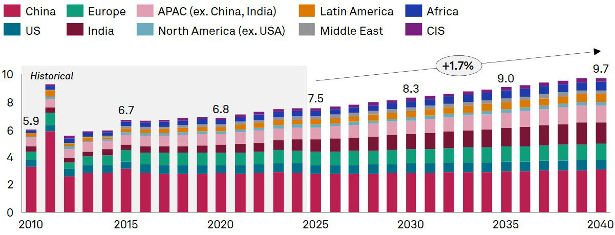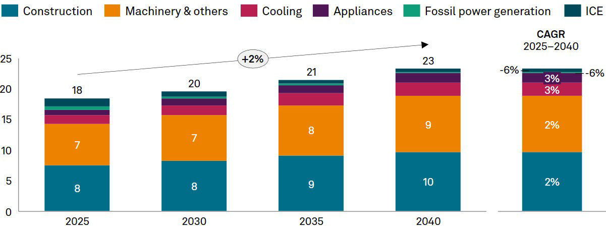 Overall, core economic demand globally is forecast to increase by 2% annually, from 18 million metric tons in 2025 to 23 million metric tons by 2040. Construction and machinery continue to be the largest contributors to core economic demand, while demand for ICE vehicles declines due to the growing share of EVs.