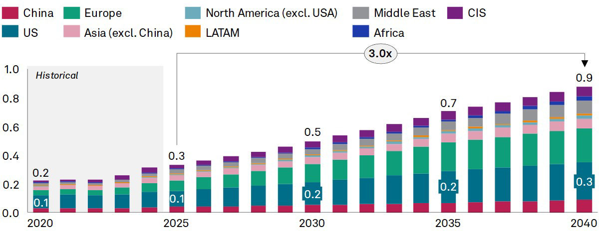 The global landscape for copper demand is rapidly evolving. Between 2025 and 2040, China and the rest of Asia are expected to account for 60% of the world’s copper demand growth, fueled by the swift adoption of electric vehicles, clean power generation, expanded electrification of buildings and infrastructure, and the extension of electrical grids. In North America and Europe, the race to build AI data center capacity and the expansion of solar, wind, and electric vehicles will serve as the primary engines driving copper consumption. Meanwhile, the Middle East is projected to see one of the highest compound annual growth rates in copper demand, approximately 4% per year through 2040, albeit from a smaller base. This worldwide surge will be shaped by policy-driven initiatives, including investments in renewable energy, grid modernization, data centers, and industrial diversification strategies embedded in national development agendas.
