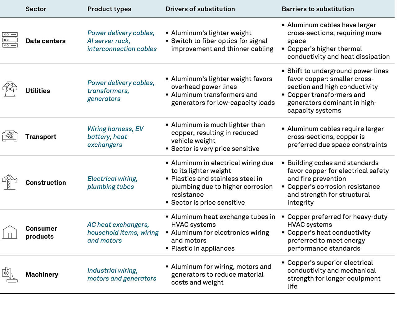What distinguishes copper from other metals is its exceptional conductivity of electricity – exceeded only by a precious metal, silver. This conductivity, along with the metal’s durability and recyclability, makes substitution difficult in most applications. While aluminum, plastics, and fiber optics compete in select uses, copper remains the preferred and/or essential material for safety, performance, heat management, and sustainability. Substitution, miniaturization and “thrifting” (using less copper per application) are limited by technical and economic factors, and the bulk of feasible substitutions are considered to have already occurred. The price ratio of copper to aluminum remains elevated, but further displacement may be limited without major technological breakthroughs.