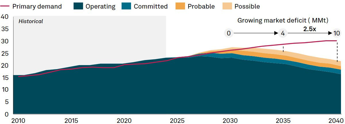 Even as global demand is accelerating along these vectors, current supply is on course to decline as existing resources age. Without meaningful expansion of supply, the result could be a 10 million metric ton shortfall by 2040.