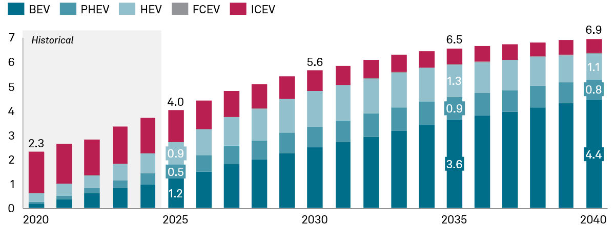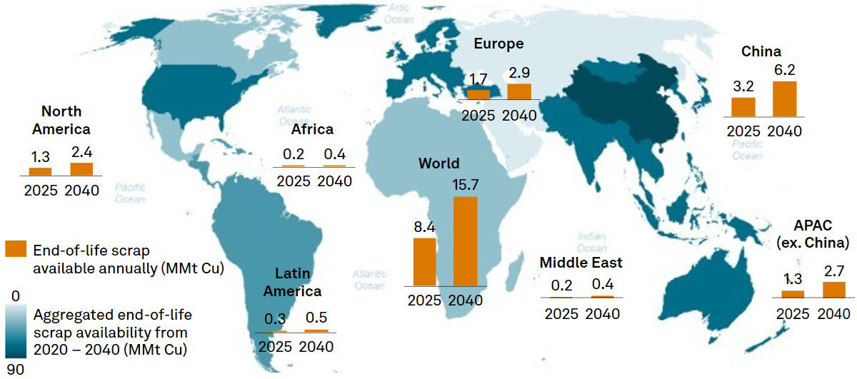 S&P Global forecasts that the ICE vehicle fleet will peak in 2026. This is not only because of growing competition from electric vehicles, but also because of increasing utilization of vehicles through things like ride hailing and car sharing, as well as longer vehicle lifespans. As a result, copper demand associated with ICE vehicles is expected to fall from 1.3 million metric tons in 2025 to just 0.6 million metric tons in 2040.