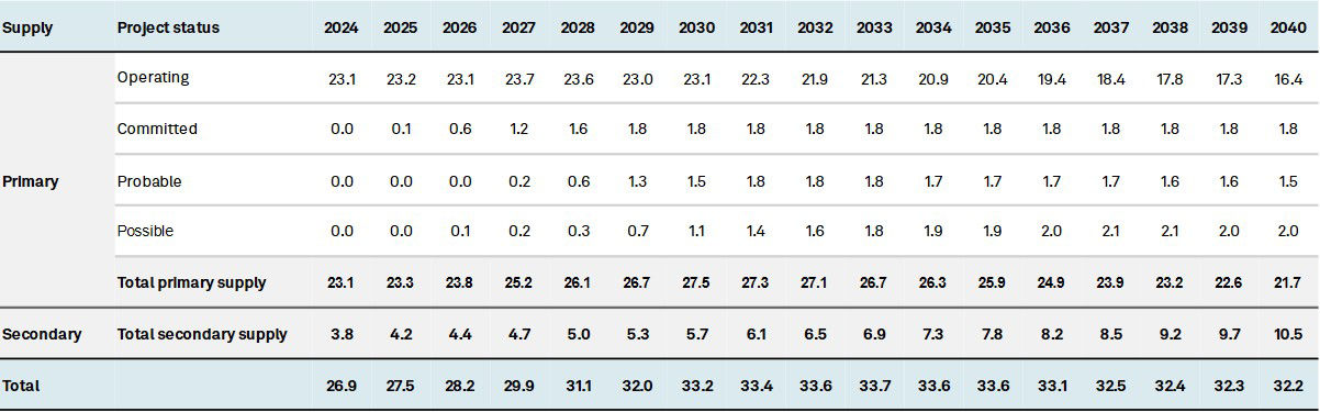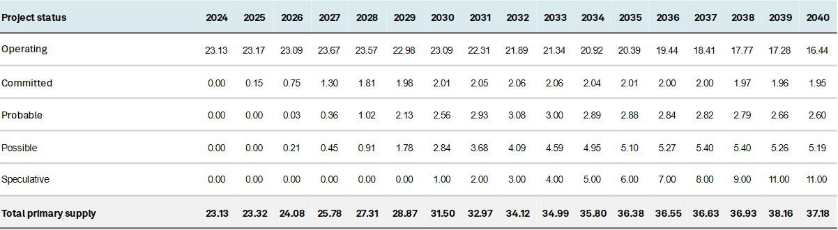 The data in Figure 85 represents unconstrained supply from committed, probable, possible, and speculative projects. Speculative projects comprise assumed potential volumes from identified sources with a high degree of uncertainty (up to 5 MMt by 2040), intended to account for potential expansions, new discoveries, and other developments not included in S&P Global’s project list. To estimate the baseline (constrained/risked) production, disruption rates of 90% to 100%, 65%, and 40% are applied to forecast mine output from committed, probable, and possible projects, respectively.