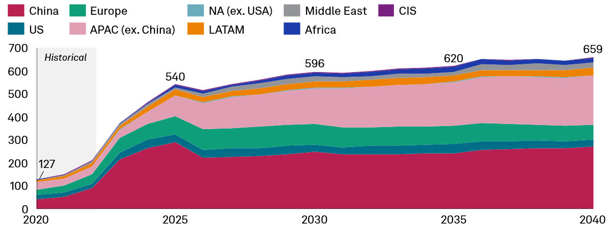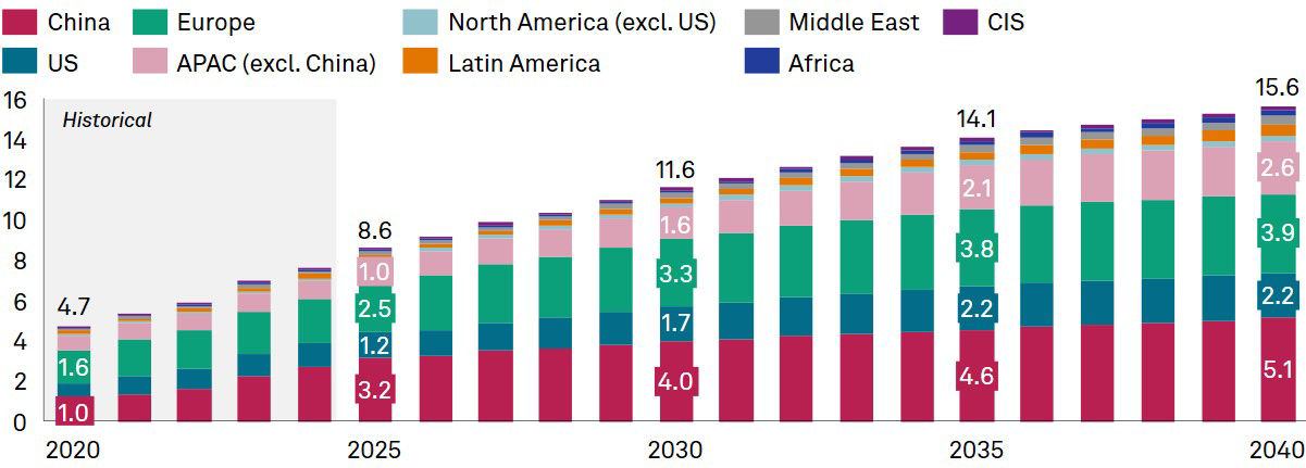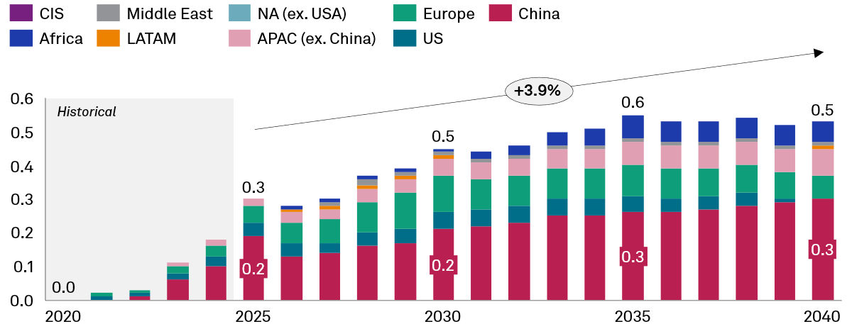 Leading the charge in energy transition copper demand growth from 2025 to 2040 are China (+1.9 million metric tons copper), Asia Pacific (+1.6 million metric tons) and Europe (+1.4 million metric tons). These regions will see copper demand growth driven primarily by the wider adoption of electric vehicles and increased spending in renewable capacity additions, driven by regulations, policies, and increased competitiveness of renewable technologies.