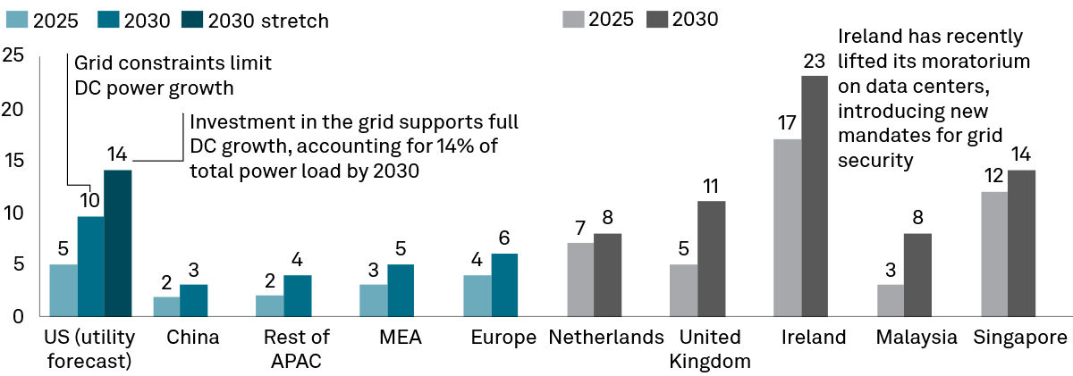 Data center development varies widely across regions. Key to enabling development are factors including power availability and reliability, land, access to markets, and the supply chain. Given that power is both a major cost and primary constraint to data centers, locations with reliable and readily available power are the main enabler for data center growth. While having access to markets through fiber cables is essential for some data centers, others need to be in close proximity to markets due to latency. Other key enablers include access to water (for cooling), favorable regulation, clean power and land availability.