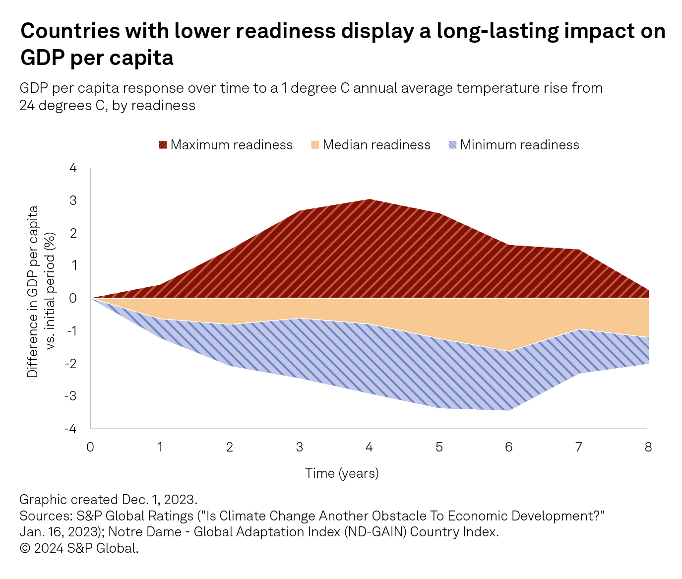 Adaptation is key to avoiding short- and long-lasting negative impacts on GDP. When readiness to adapt is high, temperature increases have no long-lasting impact on GDP per capita, even in warmer climates (see chart). However, scaling adaptation finance in the countries most impacted by droughts, extreme heat, storms, flooding and wildfires is challenging, as those countries often have less access to capital markets.