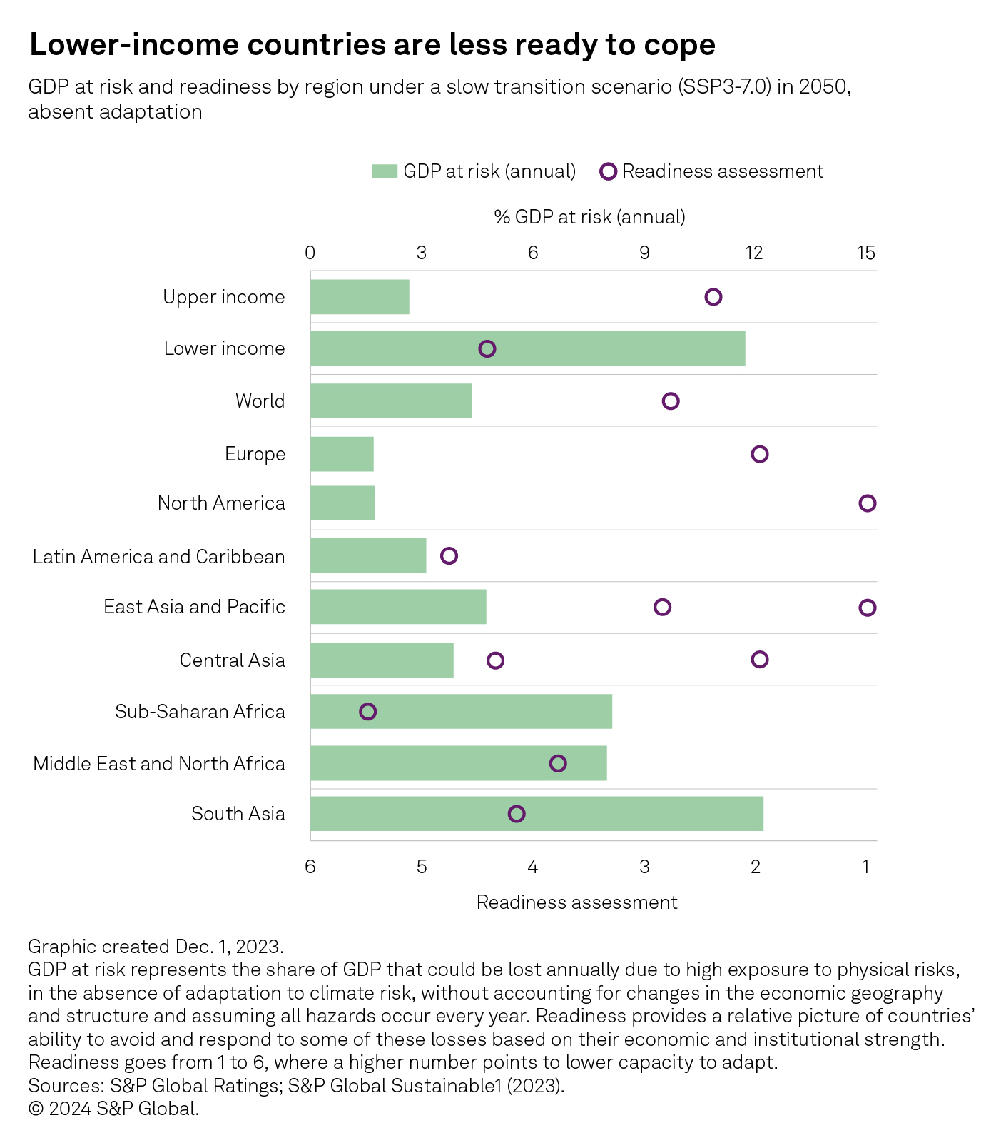 Reduced long-term visibility, less developed infrastructure and weaker social safety nets, along with lower capabilities to carry out some long-term projects, all weigh on countries’ ability to adapt to risks in general, while less flexible labor and product markets make it harder to prepare or relocate production after a shock. Our assessment of readiness to cope with climate hazards shows that the regions with greater GDP at risk will have a harder time coping (see chart).