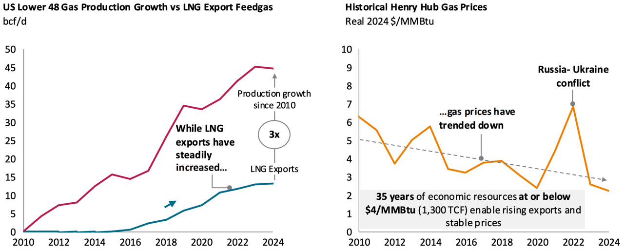 The US currently holds more than 35 years of economic natural gas supply (~1,300 Tcf) at current consumption levels (including exports), available at a cost at or below $4.00/MMBtu. These tremendous natural gas resources have supported US domestic natural gas production growth of over 40 bcf/d since 2010, dwarfing LNG export growth by a 3 to 1 ratio, while driving a sustained reduction in US prices. These significant reserves were unlocked by the combined effect of two technologies: hydraulic fracturing and horizontal drilling (collectively referred to as the “Shale Revolution”).