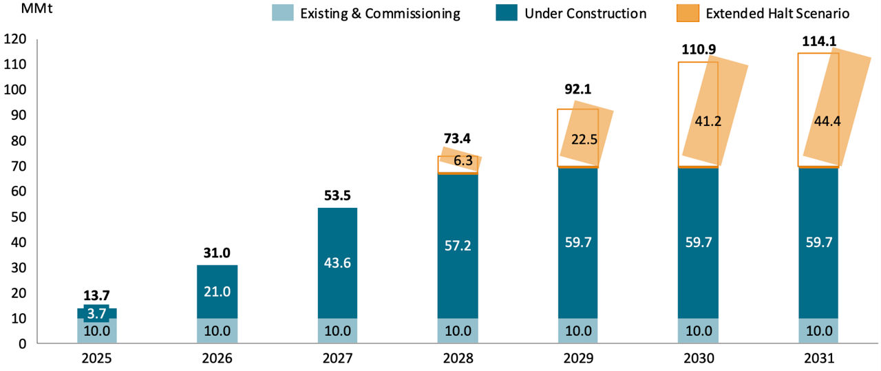 The ‘Pause’ & Beyond: Risk of a US LNG ‘Extended Halt’ Scenario presents the results of an added scenario quantifying the US and global impacts of excluding all new pre-Final Investment Decision (pre-FID) and US halted projects without FERC authorizations (28.2 & 16.2 million tons per annum (MMtpa), respectively) from S&P’s Base Case. The effects of this ‘halt’ and the projected global response will be a critical input for the companion Phase 2 report, particularly for the emissions impact analysis.