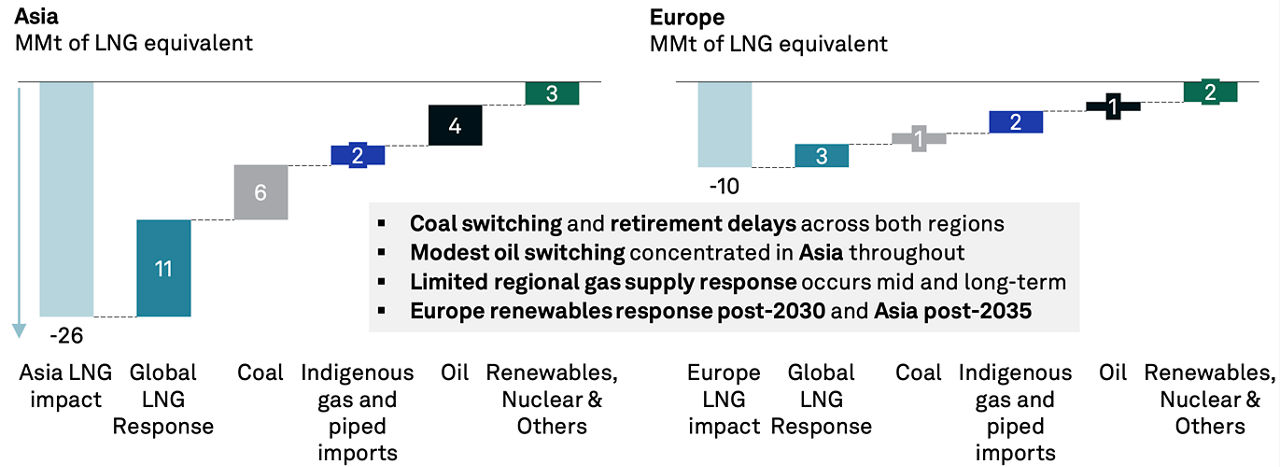 In the US LNG Extended Halt Scenario, global markets are impacted by reduced US LNG exports of approximately 40 MMtpa on average from 2028 - 2040, or 5 bcf/d. In response to this gap, 1) non-US LNG producers will increase supply, and 2) other energy sources will emerge.