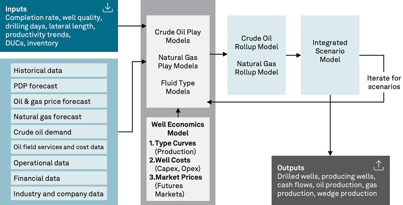 The aggregation of bespoke play-level economic models enables the computation of the price response to a variation in production target or demand. Matrices of price and production by play are developed and aggregated. Interpolations enable S&P to identify the price supporting the production of targeted volumes.