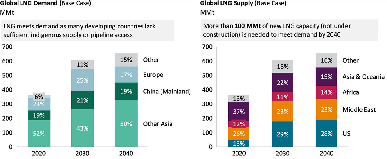US LNG exports will satisfy steady LNG demand growth globally. In the key regions of Europe, Asia and Latin America, LNG imports are necessitated by limited regional gas supplies and non-economic factors including geographic and geopolitical constraints to international pipeline development. The benefits from US LNG of security and stability of supply may outweigh cheaper and more proximate gas supply options as in Europe post Russia-Ukraine war and other places in the world. LNG is also critical to meeting energy transition needs. Demand for LNG outpaces overall natural gas demand growth throughout the Base Case period.