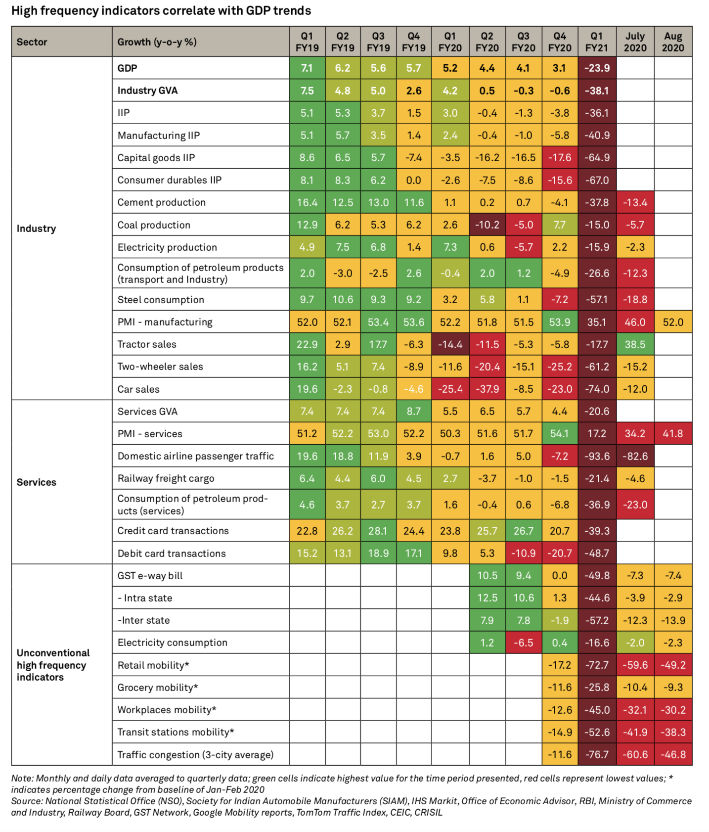 Industrial and service sectors, accounting for ~85% of GDP, suffered the most because of the nationwide lockdown, as shown in the first quarter GDP data. Both conventional and non-conventional high-frequency indicators pointed towards a deep downturn in these sectors (see table below):