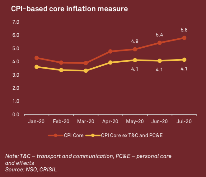 To assess whether prices are at all signalling recovery in demand or economic activity, we turn to core inflation (headline inflation, excluding food & beverages and fuel). Core inflation too, has been snaking up, from 4.8% in April to 5.8% in July, but that has not been due to demand pressures. Rise in core is largely led by transport and communication, and personal care and effects. Inflation in the former category was on account of higher petrol (11.2% in July on-year) and diesel prices (13.1%) and mobile charges (15.3%). Inflation in the latter was driven by a sharp increase in gold (45%) and silver (37.6%) prices, demand for which surged amid a rush for safe haven investments globally.