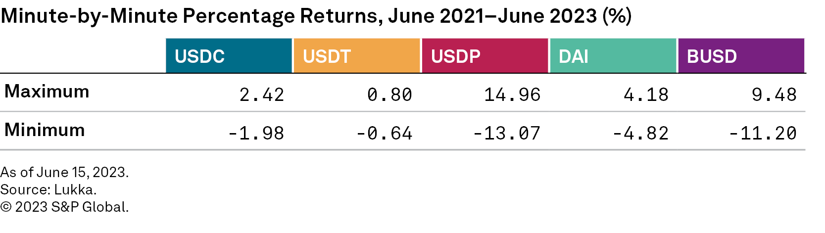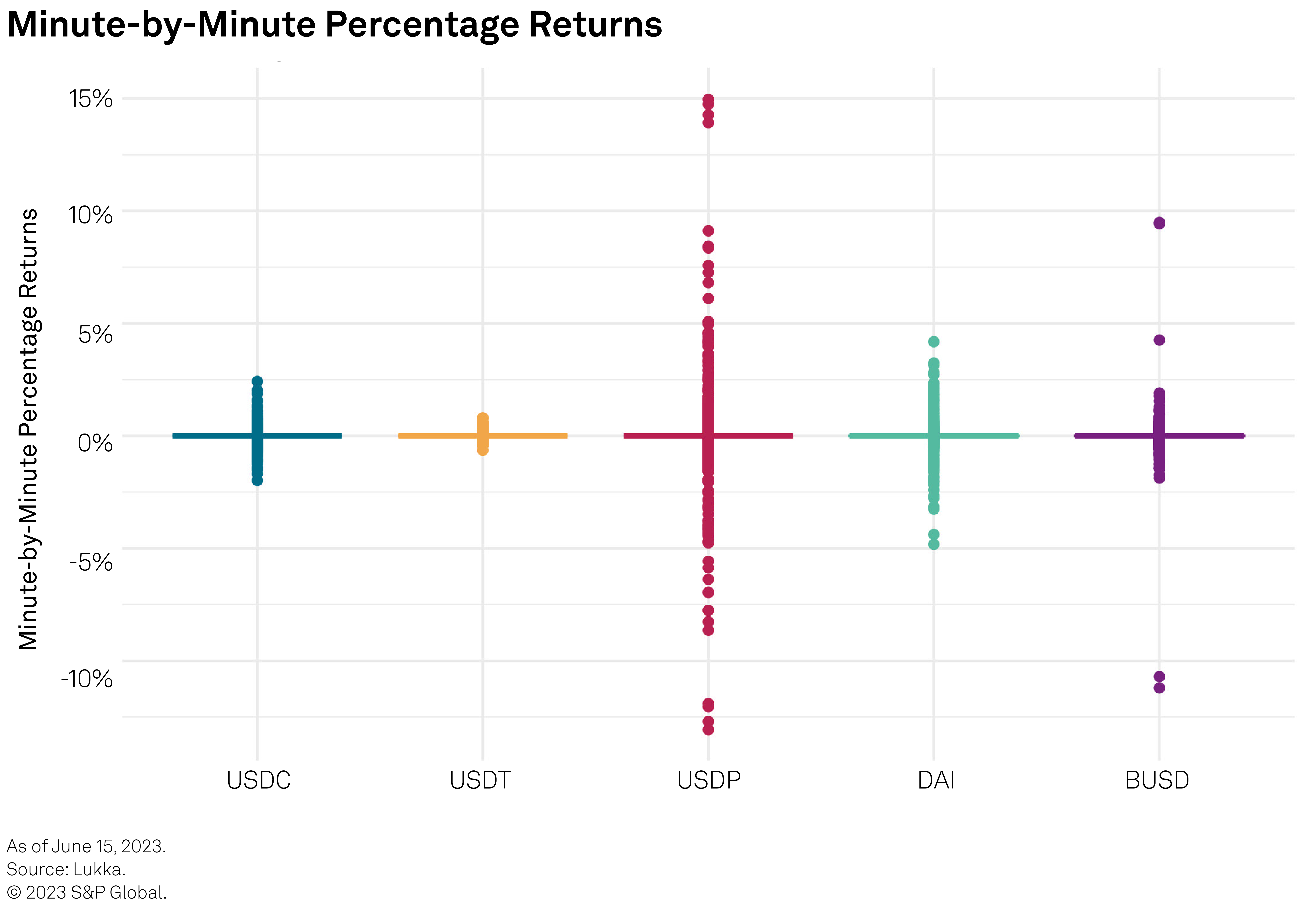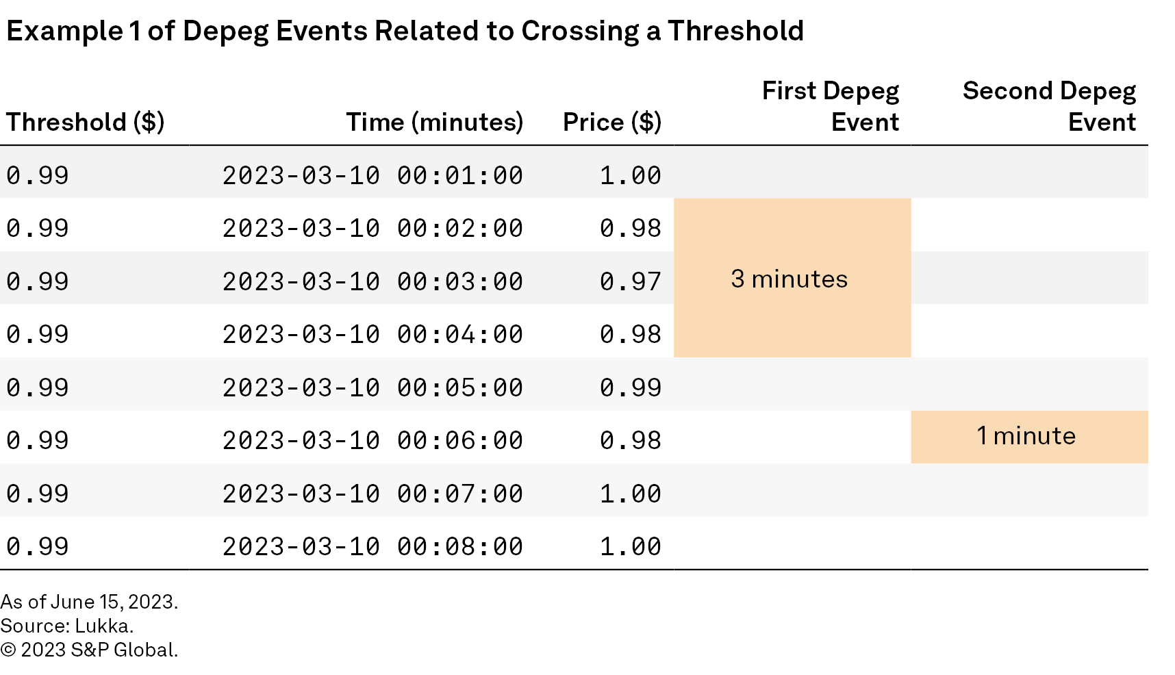 Our analysis found that to study the depeg from $1 it is best to focus on various magnitudes of depeg based on different thresholds and then to quantify the frequency and persistence of depeg events based on the threshold being breached. It is less impactful for the price to drop below $0.98 for one minute than if it were to stay lower than $0.98 for 100 minutes.