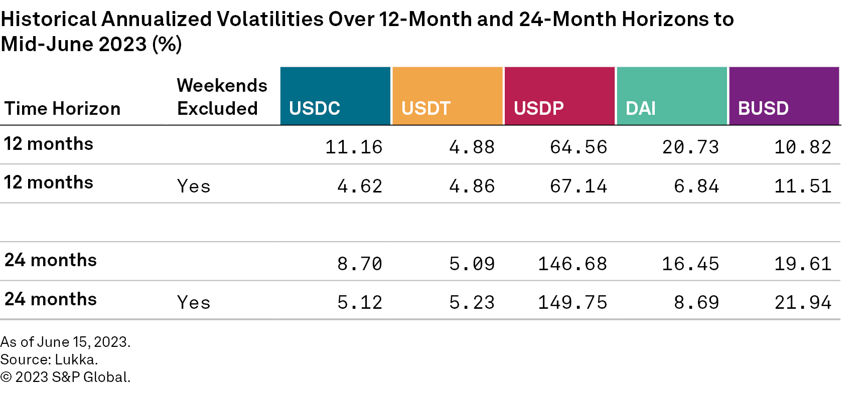 For a couple of these stablecoins, excluding weekends almost halves their volatility. This may be related to the fact that they rely on traditional payment rails that operate only during normal banking hours.