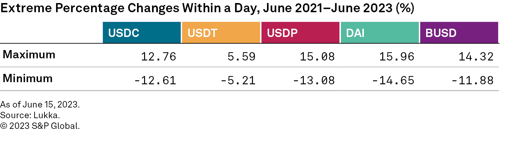 While our data is minute-by-minute, we also looked at the maximum price drops and increases during one day to gauge the deviation from the $1 peg over the course of a day. Figure 12 shows that USDC, DAI and USDP exhibited the worst daily price declines among the five coins.