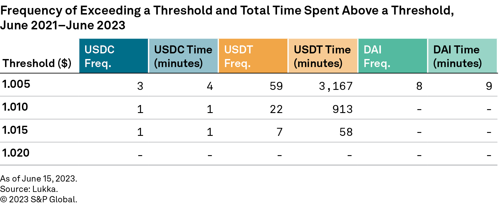 Depeg events above $1 are both less frequent and of shorter duration. Figure 23 shows that in the 24 months ending June 2023, USDC, USDT and DAI did not depeg above $1.02.