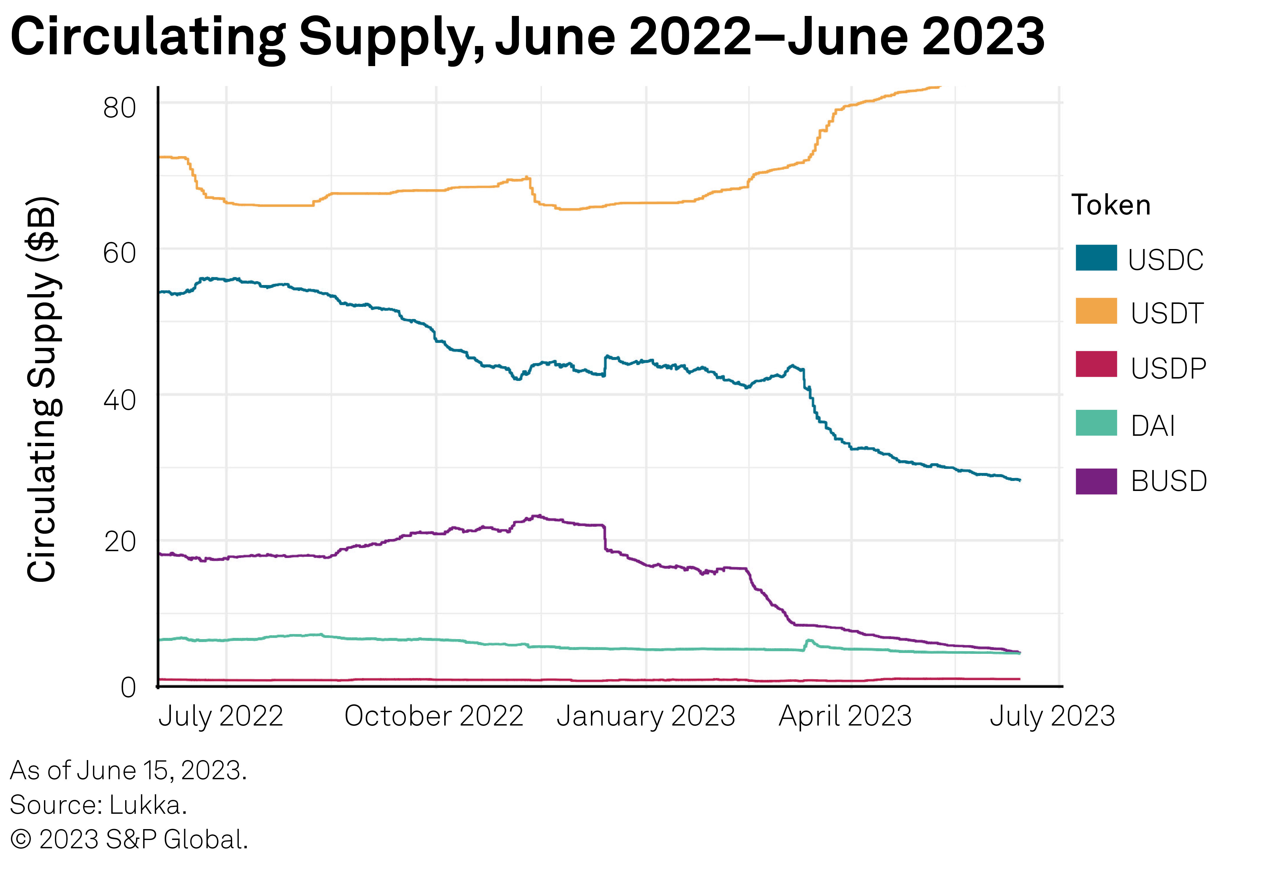 For historical perspective, we then looked at the market capitalization over a 12-month period. Figure 3 shows the historical market cap for the five coins over a 12-month period (June 2022–June 2023). Circulating supply of some stablecoins, including USDC, dropped after March 2023, and market capitalization halved in the months following the SVB event.
