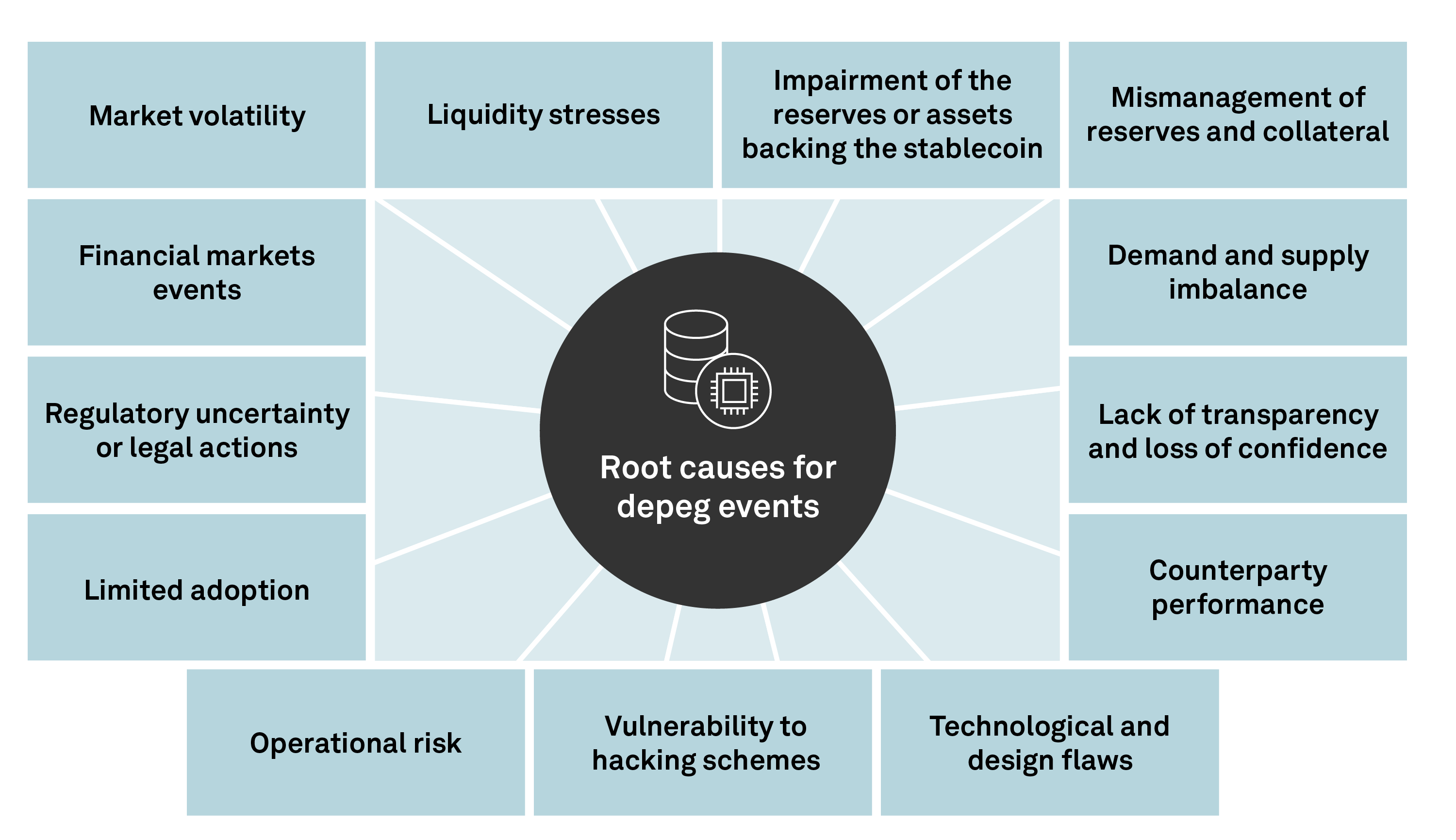 – Technological and design flaws such as that of TerraUSD, which collapsed in May 2022, may lead to a permanent depeg and could cause a stablecoin to become defunct.