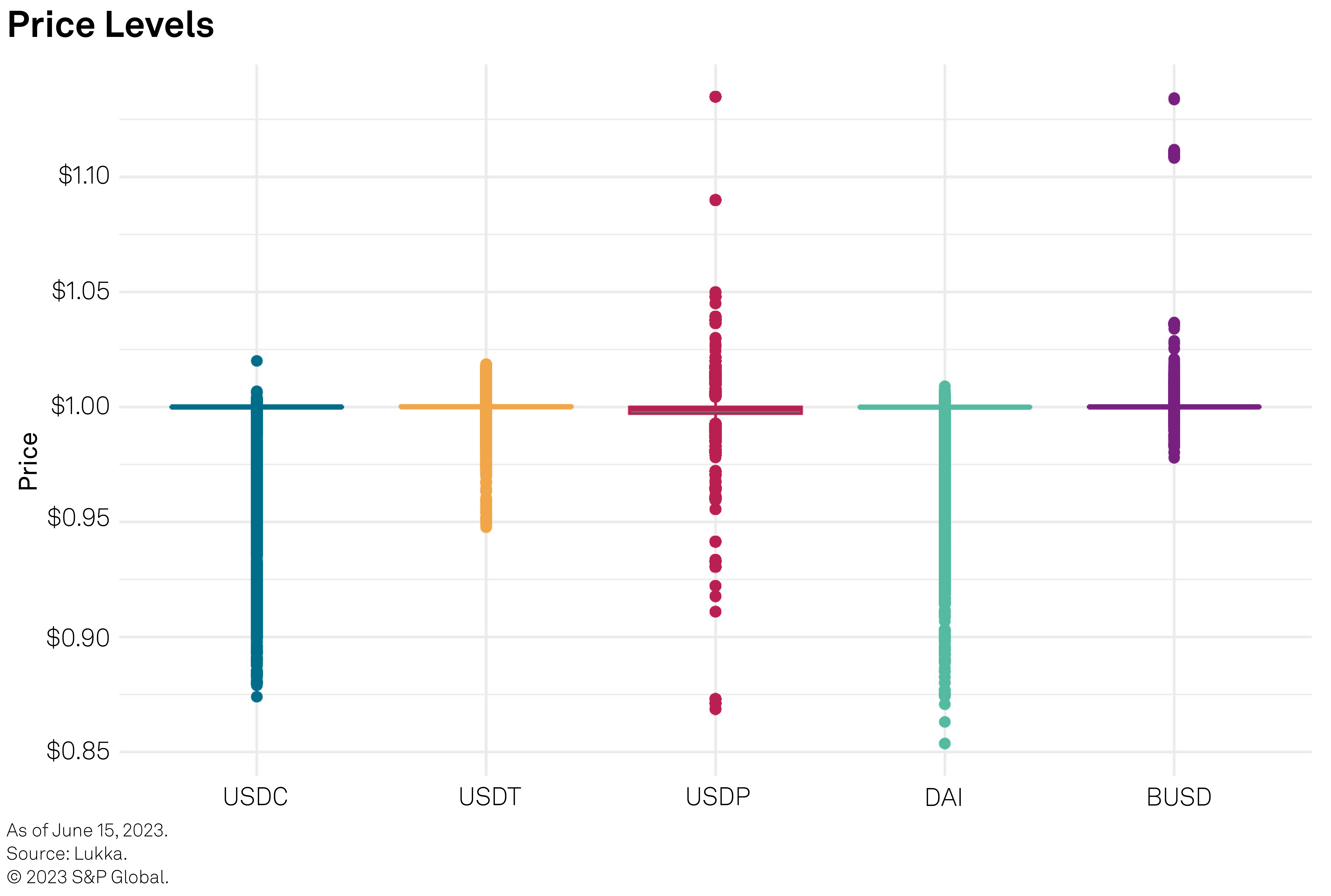 This article analyzes five stablecoins that account for more than 90% of the $125 billion market cap as of June 2023, all of which are pegged to the US dollar ($1). We studied their performance over a 24-month period ending mid-June 2023.