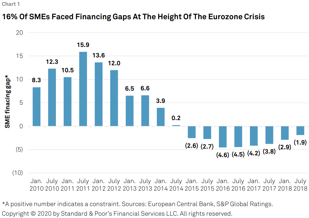 We believe that reliance on bank loans and debt is one key reason the global financial crisis hit the eurozone harder and longer than the U.S. or U.K. Increasing the equity of European corporates could help lessen the vulnerability of their external financing to sudden stops in credit markets when the cycle turns. Increased equity could also help contain a further rise in debt or leverage by promoting firms' ability to invest. The fragmentation of European financial markets has increased since the financial crisis on the back of higher risk aversion, tighter banking regulation, and the eed to wind down nonperforming loans. The result has been less capital mobility within the eurozone, especially less capital flowing from core countries to noncore countries, which prevents the European economic and monetary union (EMU) from reaping all of the benefits of the single currency.
