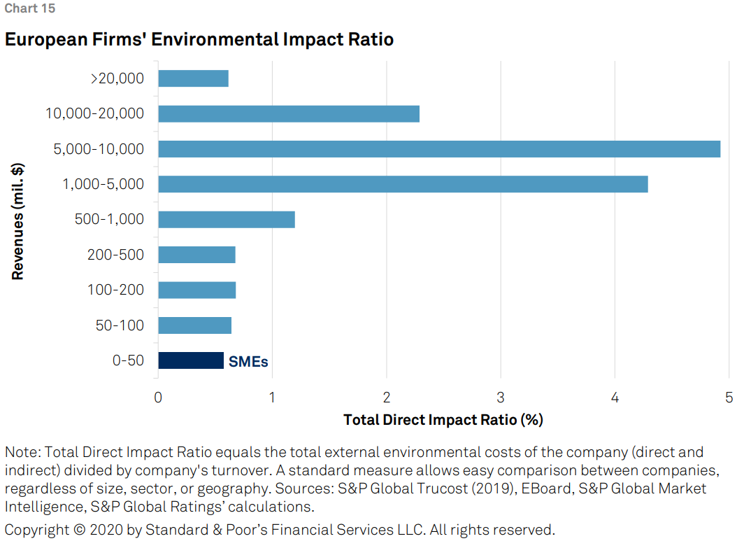 Large corporations offer many economic benefits, but from a strict environmental point of view, European SMEs appear to be more sustainable than large firms are. They generate lower external environmental costs (relative to turnover) than larger firms, according to data as of end-2018 by Trucost, part of S&P Global (see chart 15). Further analysis of the Trucost dataset indicates that SMEs are also “greener” in sectors with a higher environmental impact (such as utilities and materials). Because SMEs as a group have less environmental impact, the CMU’s goal of promoting and developing them would shift the EU economic fabric toward greener activities. That’s because, in the utilities and materials sectors, for example, they are less involved in industrial processes than large firms. Additionally, in the Trucost database, the density of SMEs is higher in industries with a lower environmental impact such as health care and real estate.