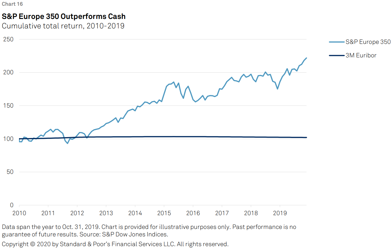 Over the last decade, a more balanced allocation toward equity markets instead of bank deposits, as proposed under the CMU, would have increased the return of EU savings. For instance, the S&P Europe 350 Index's compound annual growth rate (8.76%) outperformed European cash rates (0.21%; see chart 16). The S&P Europe 350 Index, launched in October 1998, serves as a benchmark for the large capitalization European stock market. As we analyze below, its performance has also been superior to that of the majority of actively managed European large capitalization equity portfolios.