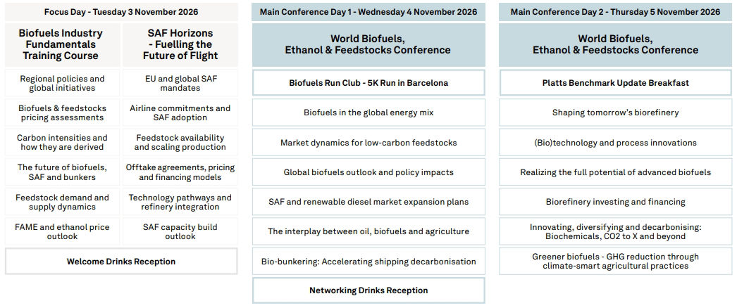 Join us in Barcelona for three days of strategic discussion, expert analysis and high-value networking, and help shape the next chapter of the global biofuels industry. We look forward to welcoming you in November 2026.