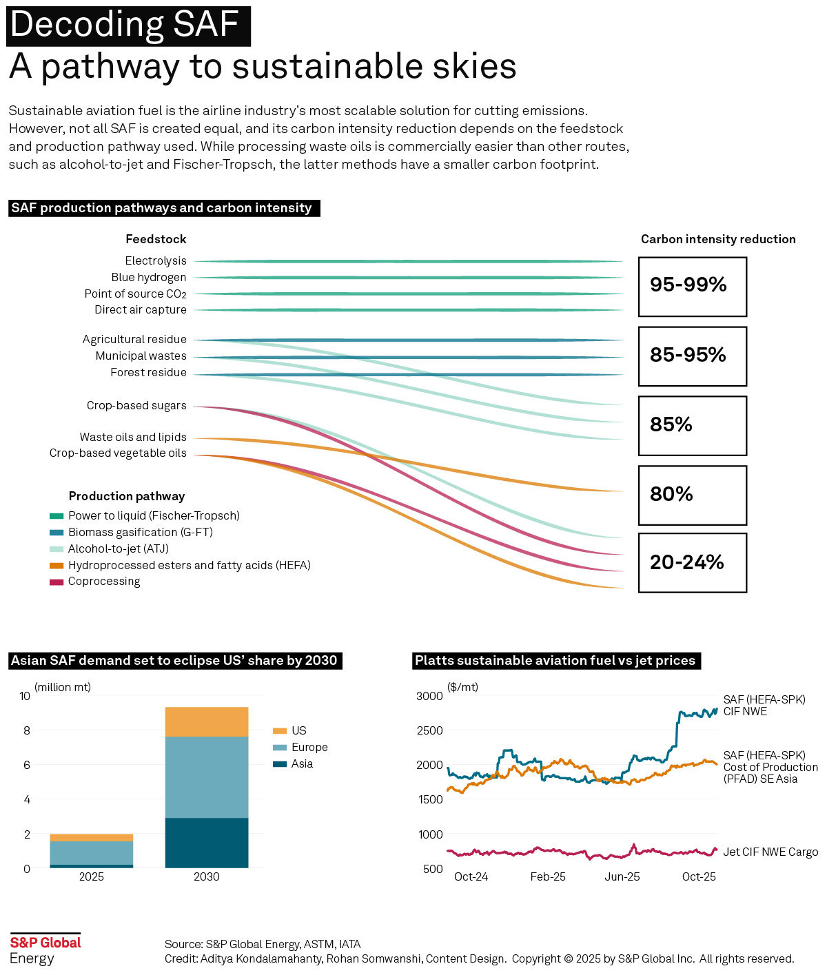 So far in 2025, SAF prices have fallen to record lows, with the global SAF market oversupplied, a notable shift for a market where lack of availability is a long-term concern. Prices have rebounded ahead of the first European compliance deadline, with outright prices reaching more than $2,750/mt over the third quarter.
