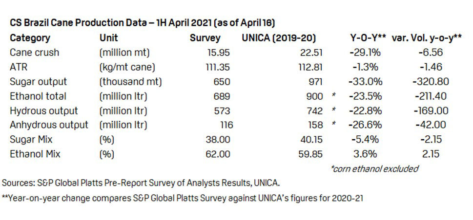 Sugar production in the key Center-South Brazil region is expected to total 650 thousand mt in the first half of April, a decrease of 33% year on year, an S&P Global Platts survey of 11 analysts showed April 26.