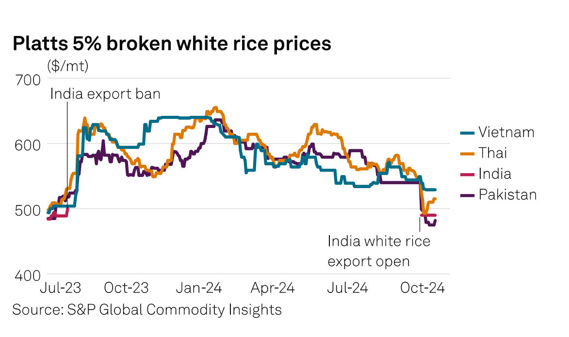 The restrictions on Indian rice exports are set to ease further, as the current minimum export price of $490/mt FOB on white rice exports is expected to be removed soon, sources told S&P Global Commodity Insights Oct. 17.